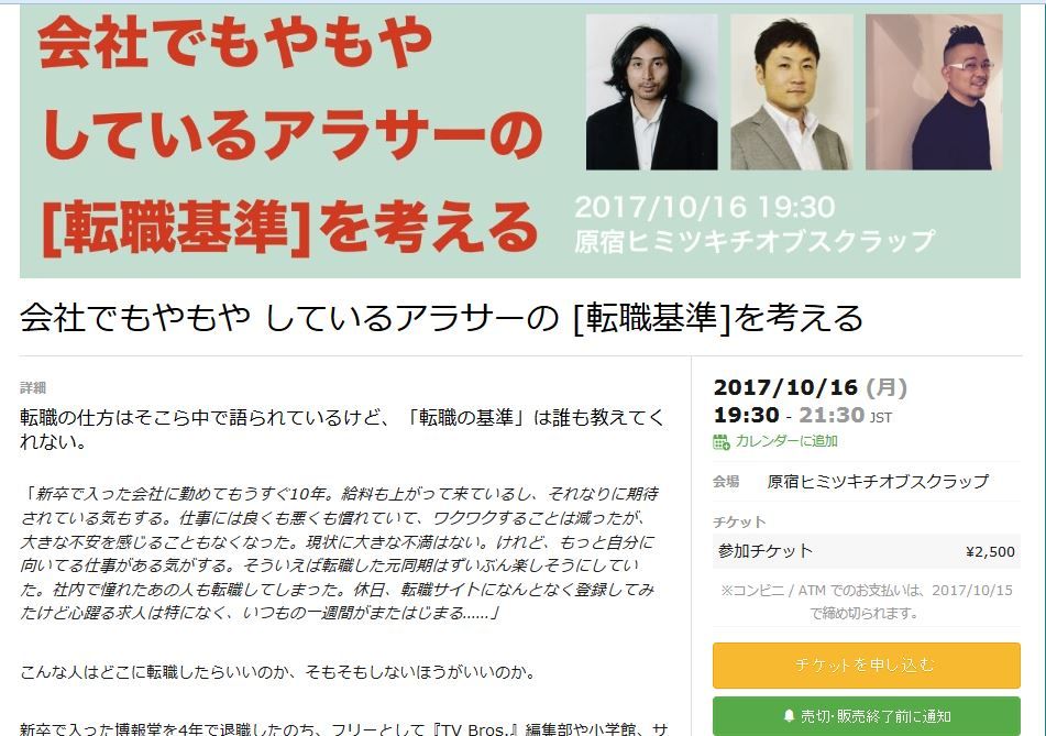 アラサーになると「転職」が頭の中に選択肢として入ってくるんですよね。社会人になって5年経ちました。そろそろ次の段階に行かなくては私は人生における成長ができないのではないだろうか……。知り合いの中には子会社の社長を任されている者もいるし、大学の同期は海外赴任をしている者もいる……。それに引き換え私はそれなりに楽しい人生は送っているものの、このままでいいだろうか--。そんな方に向け、会社でもやもや しているアラサーの [転職基準]を考えるを10月16日に開催します。