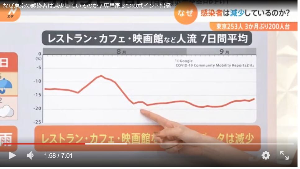 そして、同氏の慌てぶりは、9月21日、JNN(TBS系)のニュースでも表れた。「なぜ東京の陽性者は減少しているのか? 専門家3つのポイント指摘」というコーナーを約7分間にわたって展開したがこの登場シーンである。番組では、8月13日が過去最多の5773人だったが、9月21日が253人にまで減ったことについて言及。