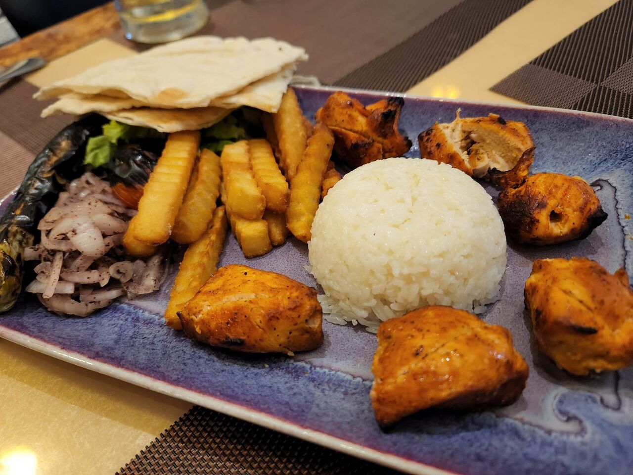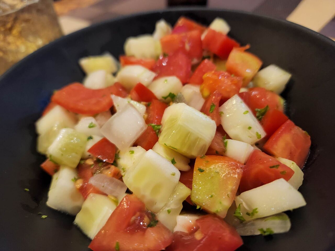 すると、従業員がやってきて「羊肉の角切りはない。チキンだけだ」と言う。えーーーっ! と思うものもないものは仕方がない。我々探検隊はチキンのケバブを頼みました。そしてまずは羊飼いのサラダがやってきました。まず、そのルックスを見た時に仰天しました。