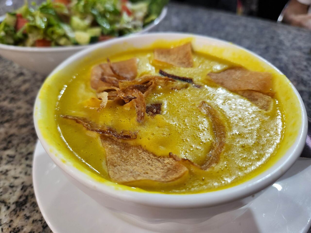 「あのさ、コレ、切り方がデカ過ぎないか?」と。通常このサラダは、7mm角的な大きさで出てくるのですが、明らかに1.3cmぐらいはある。そしてスプーンですくって皿によそってみました。……味がない……。しかも妙なインド風のスパイスの味がする。塩と胡椒と酢がまったく効いていない。卓上の塩をかけたら若干味は改善したものの、胡椒をかけたら怪しいインドスパイスと相まってさらにマズくなる。この段階で我々は「この店、相当ヤバいのでは……」という疑惑を持ち始めますが、しかし店の人に敬意を表したいのとせっかく来たのだからなんとかいいところを見つけようとします。