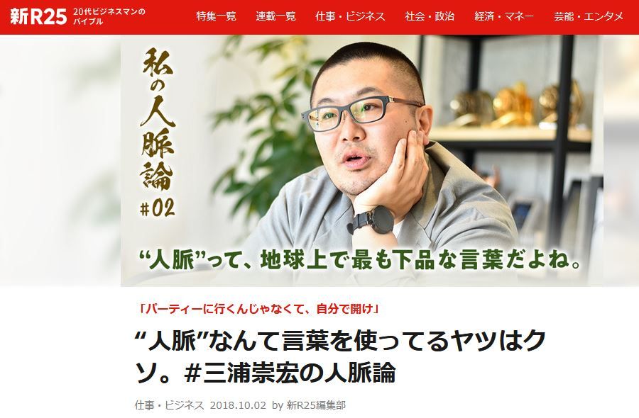 2018年10月02日 “人脈”なんてことばを使ってるヤツはクソ この言葉が素晴らしいので追記するぜ 今、もっともイケてるコミュニケーション関連のクリエーターというかプランナーというか、要するになんだかよく分からないけど「オレはオレ」的な三浦崇宏さんの「人脈」に関するインタビューが最高だったので、今回はワシも彼の「人脈論」に影響を受けてそれを書いてみます。三浦さんは新R25編集部から取材がちゃんと来ましたが、ワシにはそんな取材来るわけないので、勝手にこの記事の文体をパクって人脈論をぶってみます。続きを読む