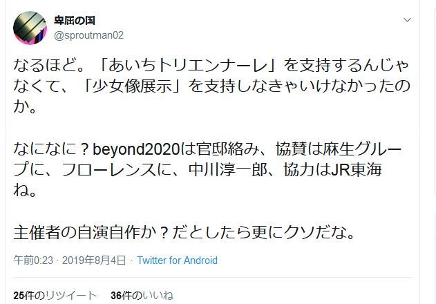 あいちトリエンナーレについて 「卑屈の国」 @sproutman02 お前、テキトーなこと書いてるんじゃねぇよボケが