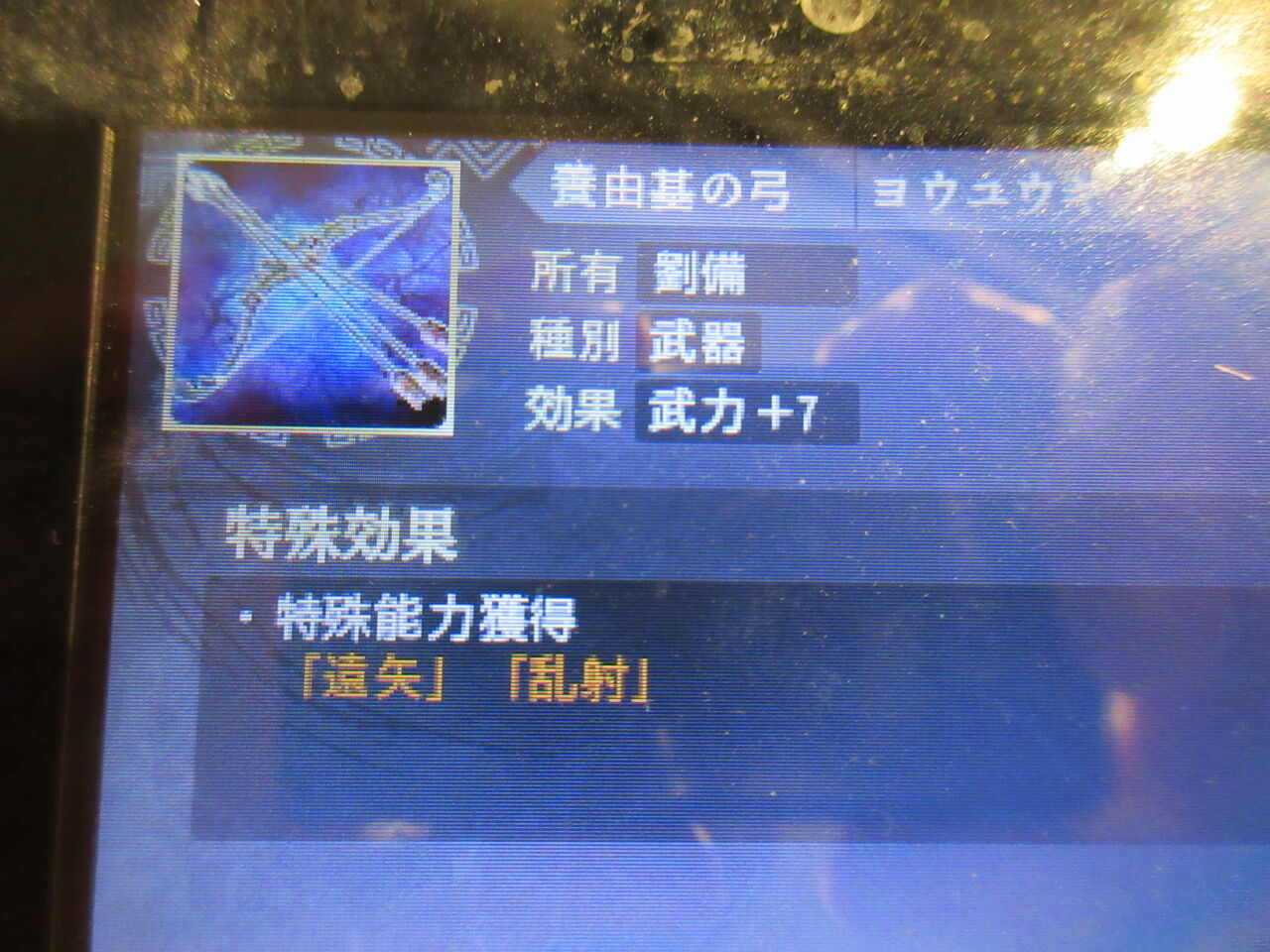 まぁ~、なんでオレは3DSの『三國志』をもう7年もやり続けているんだよ。そしてまったく飽きないんだ……と自分でも呆れるのですが、面白いのだから仕方がない。ここでは、武力を高めるアイテム「弓」をいかに入手するかについて。オレは自分の兵隊が減らない弓攻撃が好きなんですよ。だからこそ「弓神」を持つ夏侯淵、黄忠、呂布、太史慈が好きです。SP武将では花栄も弓神を覚えるのですが、何しろ最初の5つの特殊能力はすぐ覚えるものの、弓神を覚えるまでに時間がかかり過ぎて結局使いようがない武将になってしまいます。まずは「養由基の弓」から。